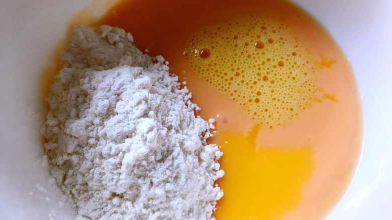 8. 搅拌好的蛋液加入胡萝卜牛奶泥中