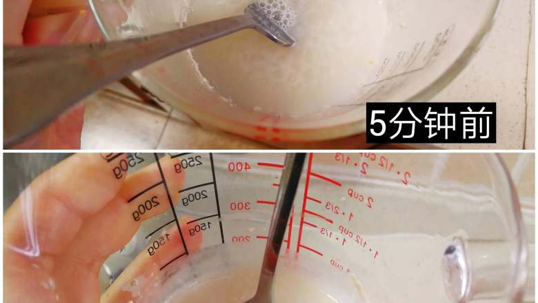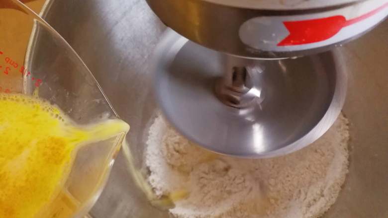 3. 将水料缓慢加入混合好的粉料中,揉至扩展阶段,就是能撑出膜就可以了,不用到完全阶段。