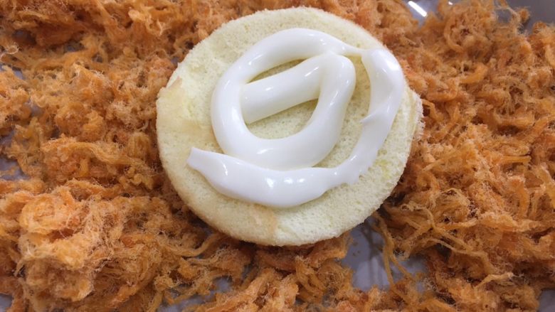 12. 180度20分钟左右,蛋糕表面上色就好。等待的时间准备肉松和沙拉酱。