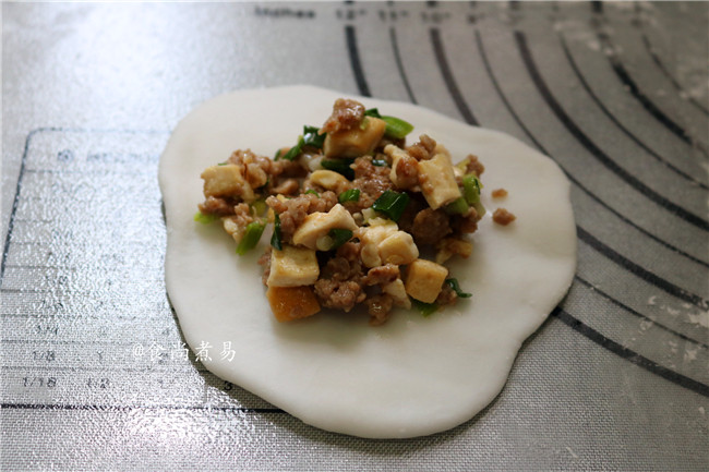 10. 小面团用擀面杖擀薄,中间放入馅料