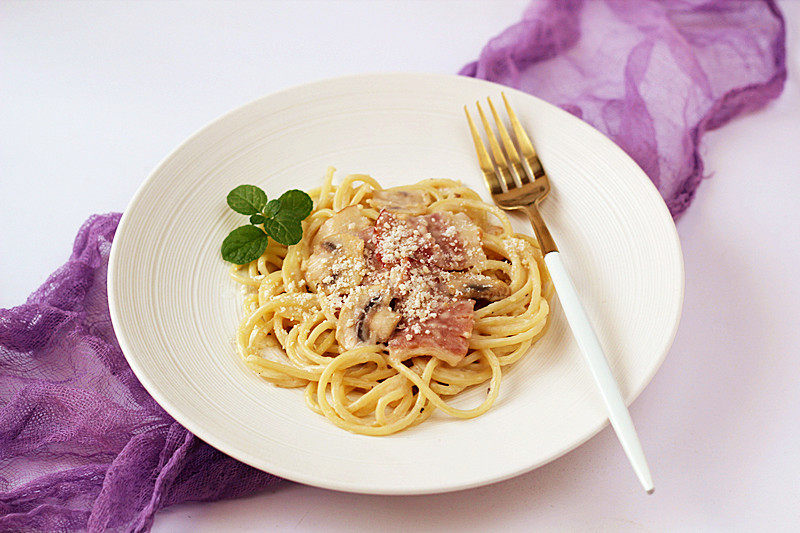 白酱是西餐中的基础酱料之一。白酱在意大利面和各色焗菜中,是必不可缺的酱汁。可以配意面、牛排、烩饭,是个百搭款酱汁。 这次我用白酱与煎香的培根及口蘑搭档,做个意大利面;再撒入些帕玛森芝士粉,使意面更是增添了浓郁的芝香奶香味。给这寒冷冬日带来阵阵幸福暖意~~