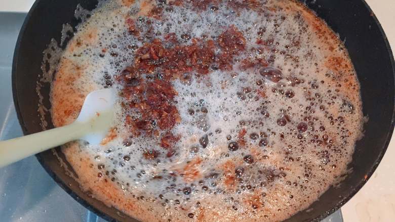 7. 炒出香味后放入冰糖,水分收至微干,锅中冒泡出油泡时加入蚝油和红烧汁