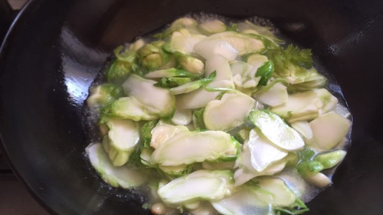 9. 锅中放入茶油烧七成热放入蒜片,马上放入菜头,我因为拍照会延误一会儿。