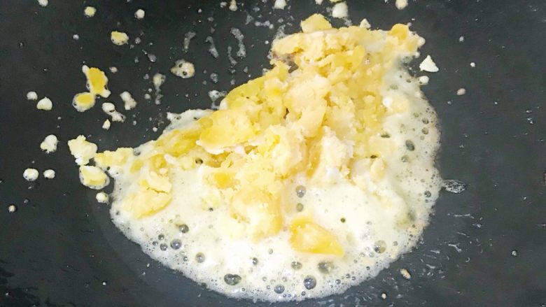 14. 锅里热油转小火 下蛋黄炒出大气泡