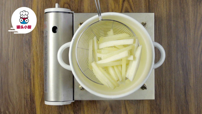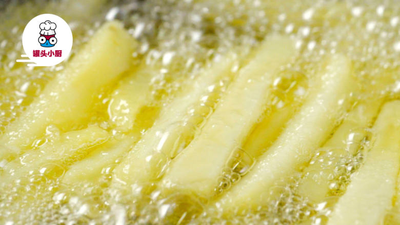 4. 锅中倒油,烧热至80℃左右,放入土豆,炸至变黄,捞出稍微晾凉,再次热油,复炸一次,炸至金黄色,迅速捞出沥油