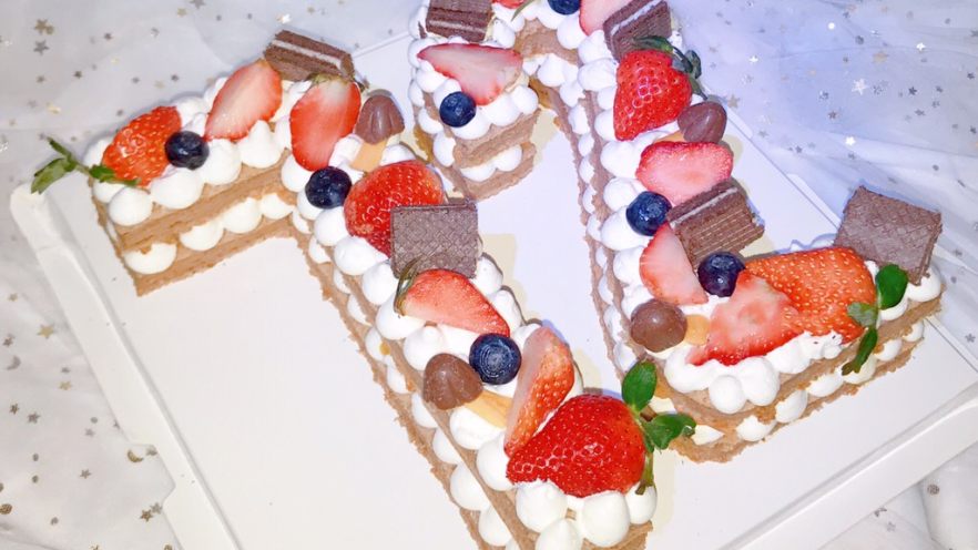 5. 烤好的蛋糕卷,出炉倒扣冷却。然后找A4纸画出自己想要的数字,在用稍厚的透明塑料片复刻,剪裁(我用的蛋糕透明围边剪的形状)做好的模具放在蛋糕卷上慢慢刻出数字。