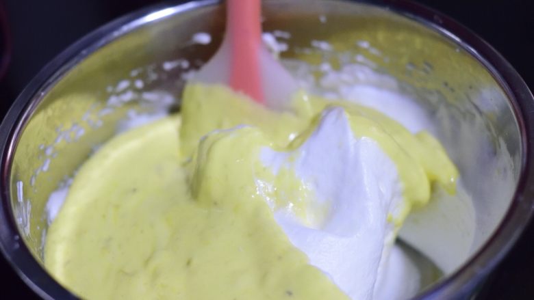 10. 将蛋黄糊刮入蛋白中,用类似炒菜的运作翻拌均匀。