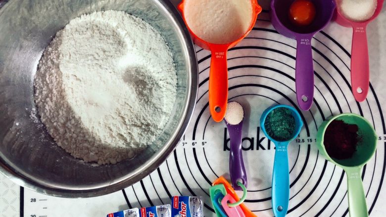 2. 除黄油,抹茶粉,红曲粉以外所有材料混合,揉出粗膜。