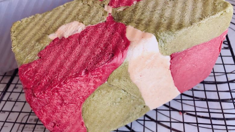 8. 两三色面团放入盆中,用保鲜膜隔开。