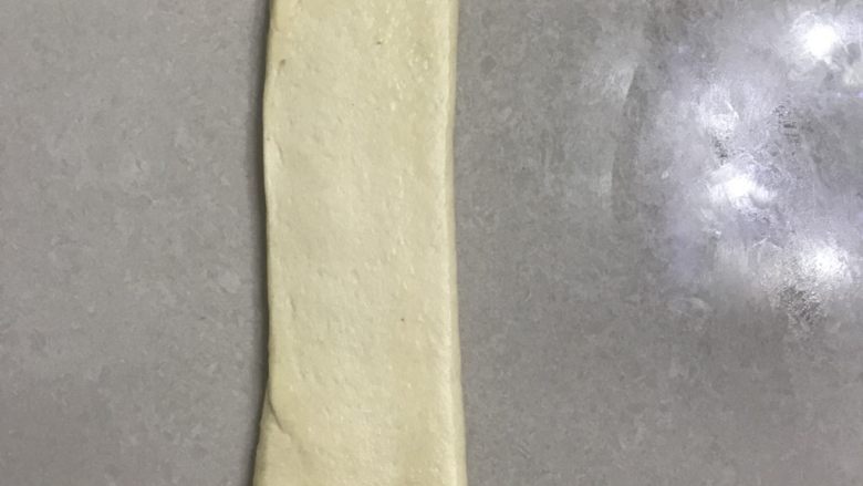 8. 把分割下来的小面团压在底下,用擀面杖擀开,整理成小长方型。