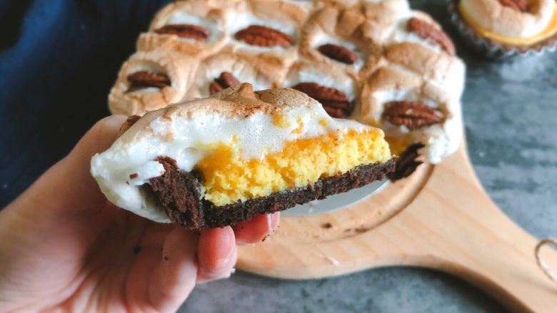 冬日的下午,一份甜蜜蜜的下午茶点心,治愈你的寒冷,补充能量。 这份点心的灵感来自于大红于甜品届的烤棉花糖。酥酥的可可黄油派皮,浓郁的芝士派馅,烤到酥脆的棉花糖表皮与绵软拉丝的内芯,再加上能量满分的碧根果,丰富的口感,让你欲罢不能。