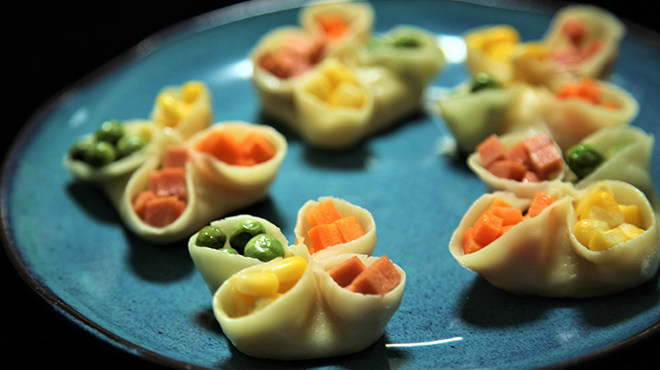 北方有句俗话:舒服不如倒着,好吃不如饺子。 今推荐很讨喜的一道小饺子。名字也相很寓意:“四喜煎饺” ,色彩艳丽,营养丰富,每个蒸饺有五种材料材配所成,用来待客和对付不爱吃饭的小朋友都是不错的选择。