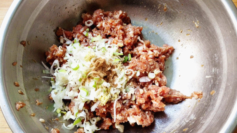 10. 把白菜加入到肉馅中,再加入20克油,拌匀,