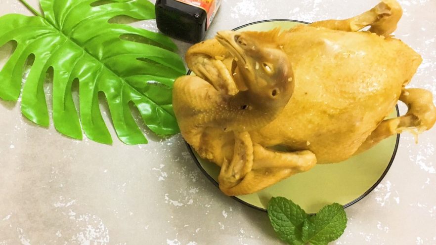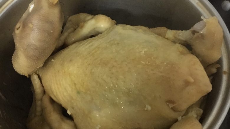 4. 烧开一锅开水,放入鸡只,大火蒸20分钟,关火后再焗15分钟