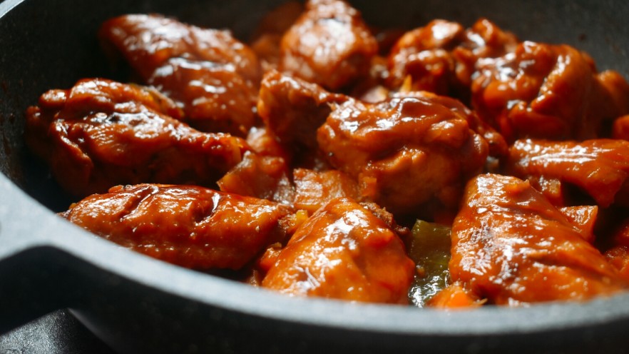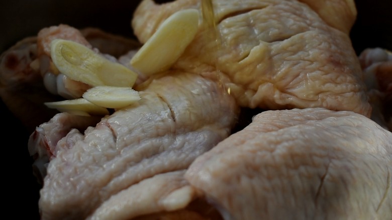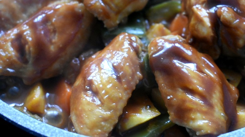 20. 将调好的三汁刷在鸡翅上边。盖上锅盖焖煮15分钟