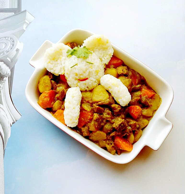 - 牛肉咖喱饭在家做简单又美味,再来一碗米饭真是绝配!如果家里有宝宝,可以把米饭捏成小动物图案哦!这道牛肉咖喱饭味道不输于外面的餐馆,大家一定要试一下,咖喱块小伙伴们可以买百梦多牌子的,口感不错。