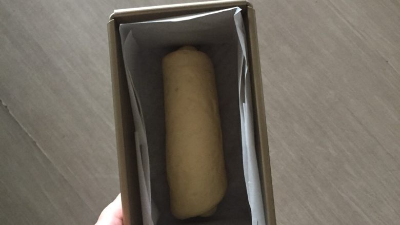 12. 卷好的面卷放入吐司盒正中间,接缝朝下,盖上吐司盒盖,发酵1.5倍大,放发酵到一倍大的时候开始制作蛋糕糊