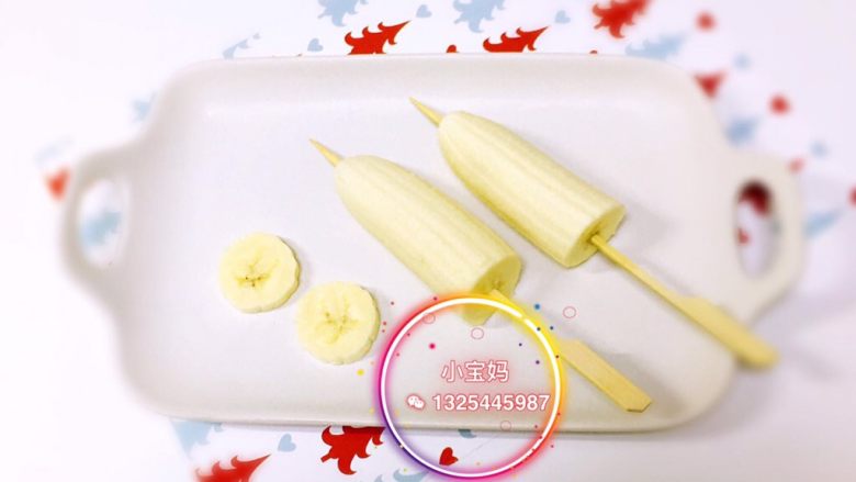 2. 香蕉去皮切成2段、用长竹签串好,再切两片0.5cm的片穿在顶部,