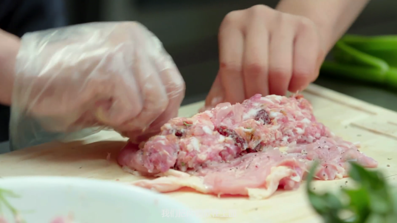 3. 处理鸡胸:在鸡胸中加入盐、胡椒、卡真粉腌制,将鸡胸和鸡腿猪肉卷放入锅蒸10分钟。
