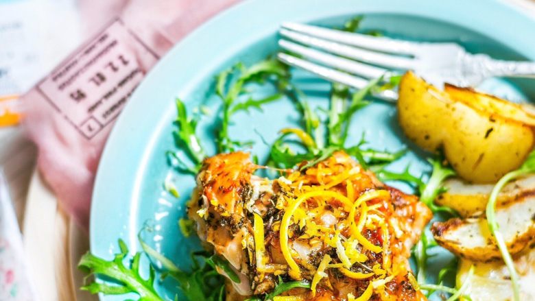 6. 将鸡腿两面薄薄的刷一层油,酱汁倒在鸡腿上 腌制半小时入味(富裕的酱汁可以留出来做沾酱) 将腌制好的鸡腿、撒上柠檬皮丝放入烤箱,不用预热 200℃烤30分钟(看到鸡腿变色 表面有焦痕即可)