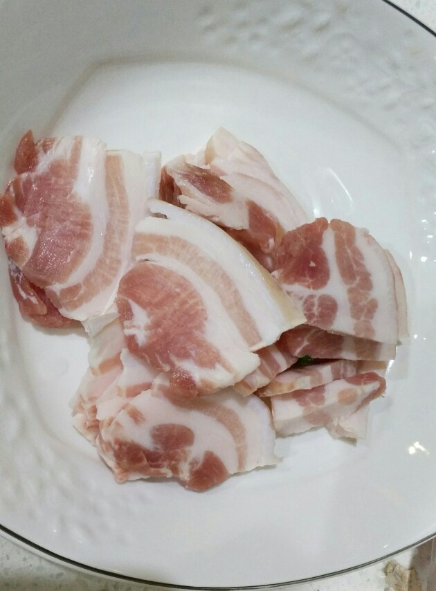 1. 五花肉切片。事先炒出来,炒到双面焦黄,把60%的油脂煸出。(忘拍了)