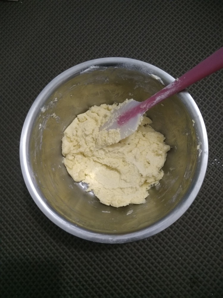9. 用刮刀不停的翻拌至无粉。不要太用力,进而会影响曲奇的蓬松度。这时就能闻到香味了。