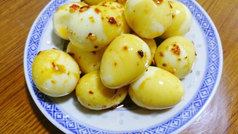 14. 今后将剥好皮的鹌鹑蛋,放入调好的料中。