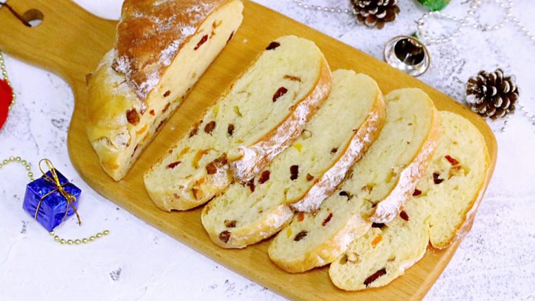 德国圣诞节必备的传统面包,这款面包象征襁褓中的耶稣,而各色干果,则是象征带给耶稣的礼物,德国人在圣诞来临之际,以分享面包的形式,纪念受难的耶稣。 皑皑白雪似的糖霜,包裹着浓郁的果香、酒香和黄油香,挡不住的美味!