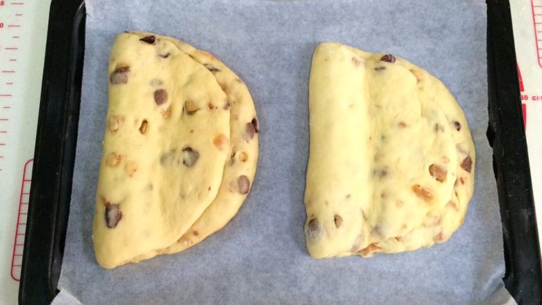7. 把发好的面团取出排气,然后分成两等份,滚圆松弛15分钟,记得盖好保鲜膜。