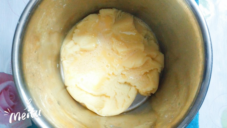 - 这里最需要注意的就是搅拌完面糊后,加蛋液搅拌的那一步,一定要放在湿布上离火搅拌,不然蛋液被烫熟了,那就成死面,后面的那就没法进行了!