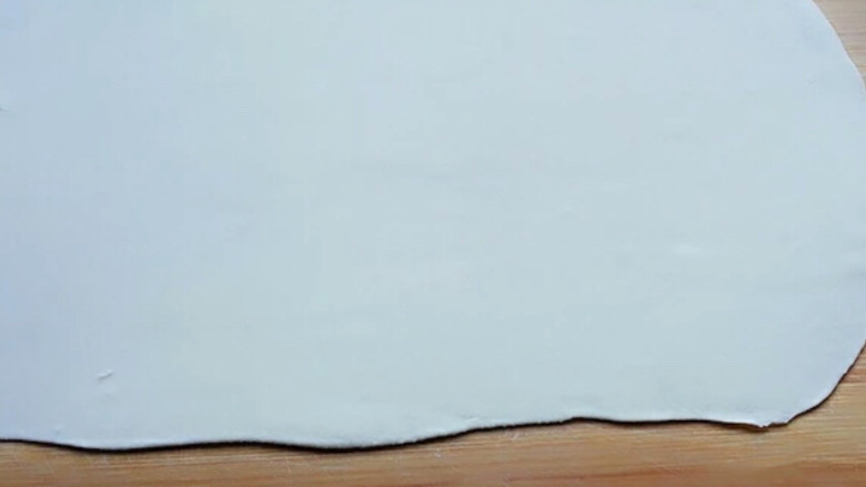 4. 将每个小面团由中心分别向四个角擀,擀成长方形的薄面皮,尽量擀得薄些。