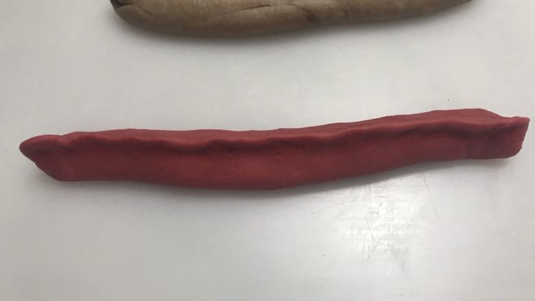 7. 卷起。搓成模具的长度。同时两个80克可可面团也擀开。