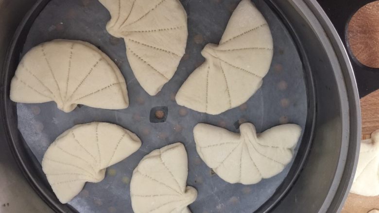 12. 笼屉内放上油纸后,把做好后的荷叶馍馍放入笼屉