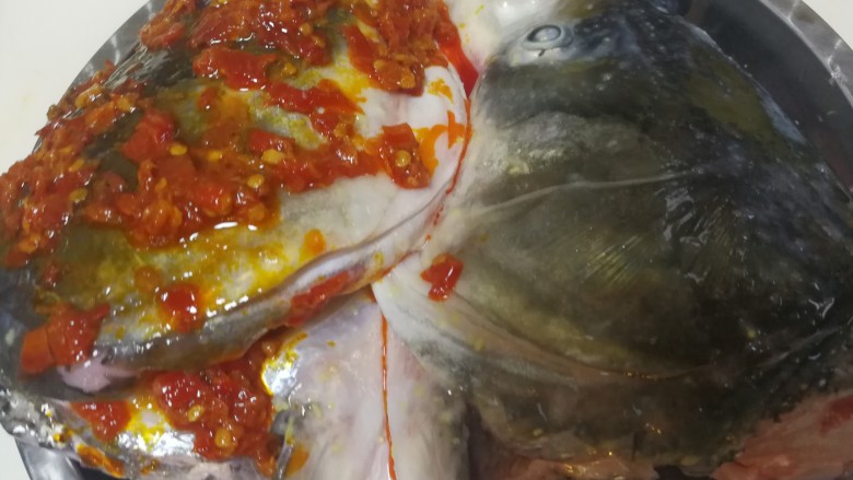 8. 鱼头的一半浇上适量的红剁椒,如果家里人不吃辣,另外一半可以不用处理