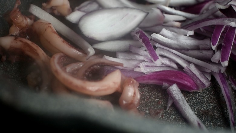 8. 炒干其中的水分。用铲子压一压鱿鱼