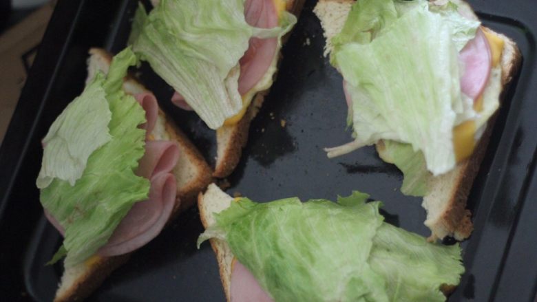 5. 面包片斜刀切成三角形,放上煎好的鸡蛋。