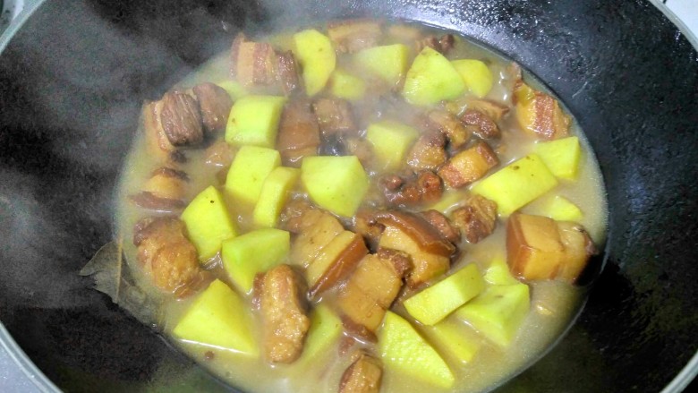 16. 加入适量水,炖至土豆变软。最后大火收汁,出锅前加少许鸡精即可。