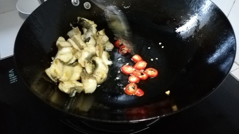 9. 红辣椒和鱼块翻炒拌匀,加水