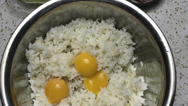 1. 所有材料备齐后,把蛋白和蛋黄分开,三颗蛋黄放入米饭中搅拌均匀,让每颗饭粒都沾满蛋液。