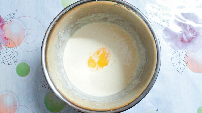 11. 把蛋黄加进牛奶橙汁糊里搅拌均匀!
