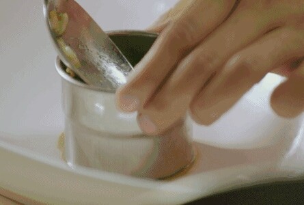 6. 炒好的菠菜放入圆形模具压实成型,放入扇贝,浇汁完成