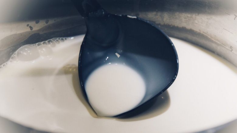 8. 观察勺壁,顺滑的乳制品会出现细小的如同豆渣一样的小颗粒。这样的状态就对了,不需要再加入白醋了。