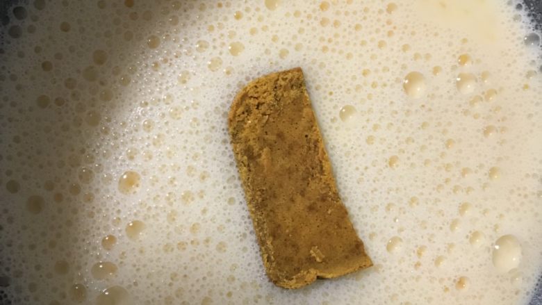 13. 加入一块咖喱,慢慢煮开,使咖喱融化,中间需要不停搅拌,把蛋液搅拌得越细越好,