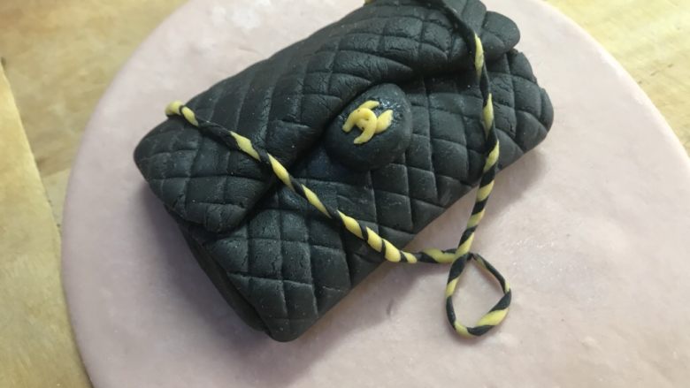 6. 取一块粉色的面擀成圆形,把包包放在上面,用黄色和黑色面搓成长条,做成包带。