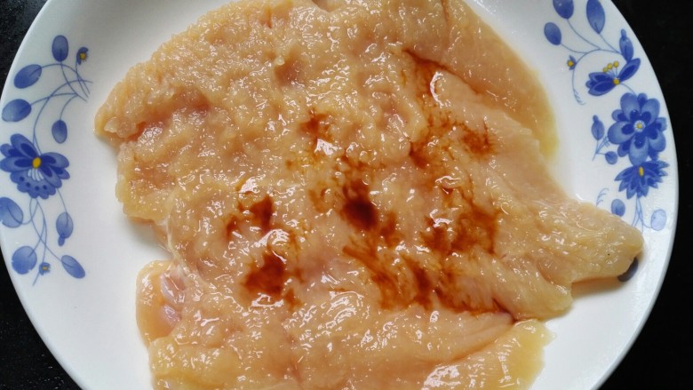 3. 用刀把鸡胸肉轻轻敲打一遍,这样口感会更好