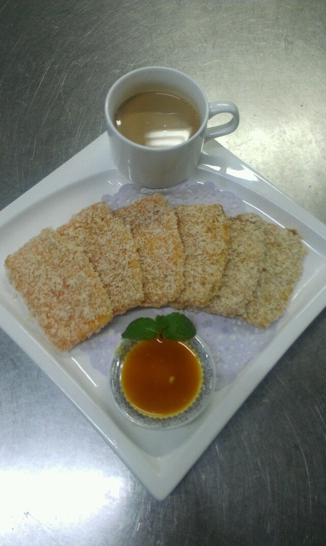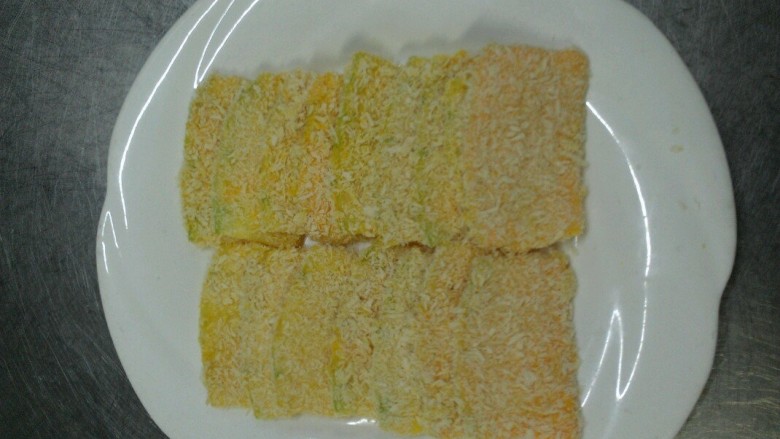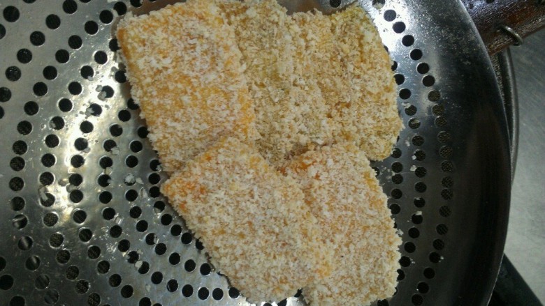 6. 把敷上蛋液的冬瓜片放到面包糠里面