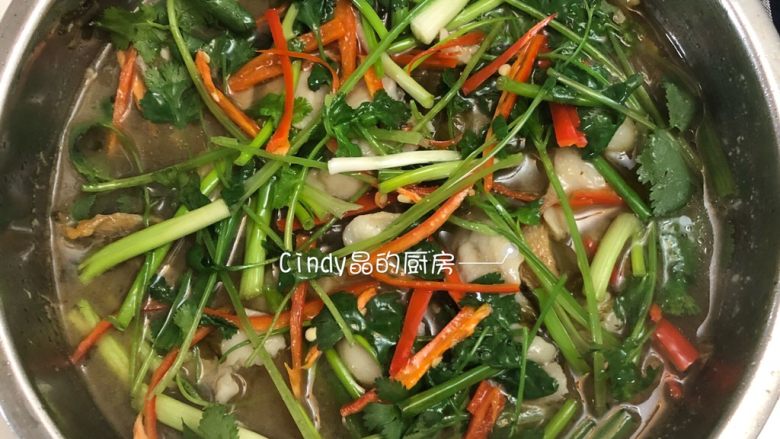7. 最后装盘撒上葱段,香菜,辣椒,泼热油即可