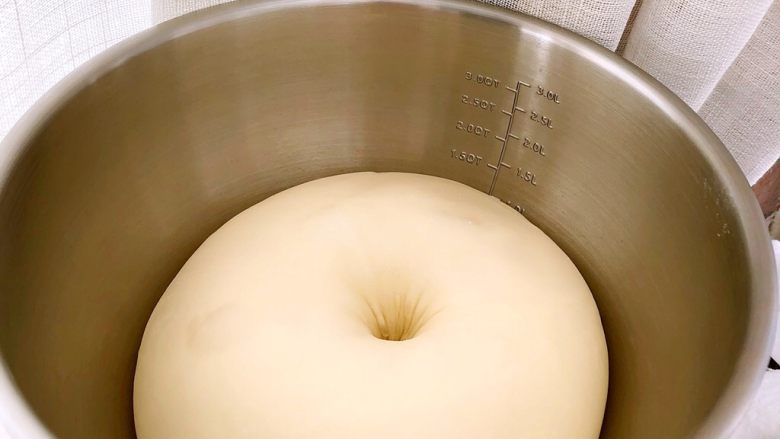 9. 放入发酵箱进行一次发酵,发酵温度在28度、湿度75%,发到面团约为原体积两倍大左右取出(没有发酵箱,可以盆上盖保鲜膜,放入烤箱,底部放一盘温水帮助发酵,时间会比较长,看面团状态)
