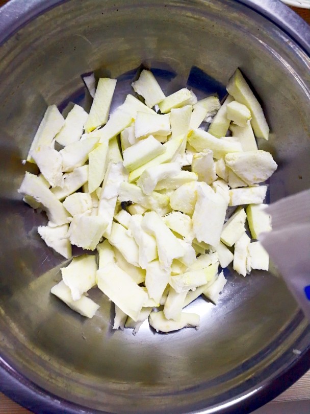 5. 留下白色的瓤,切成小条;