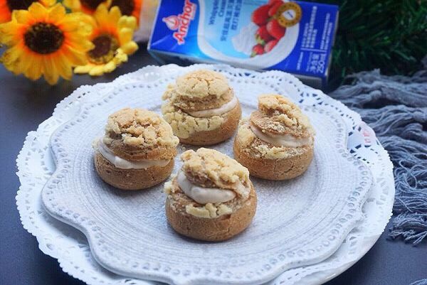 10. 取出酥皮,切片摆放在泡芙体上面用手轻轻压一下把泡芙的尖尖压下去,放入200度预热好的烤箱中转180度烤8分钟后再转165度烤10分钟左右即可,放置余温后取出来,中途切记不要开烤箱哦